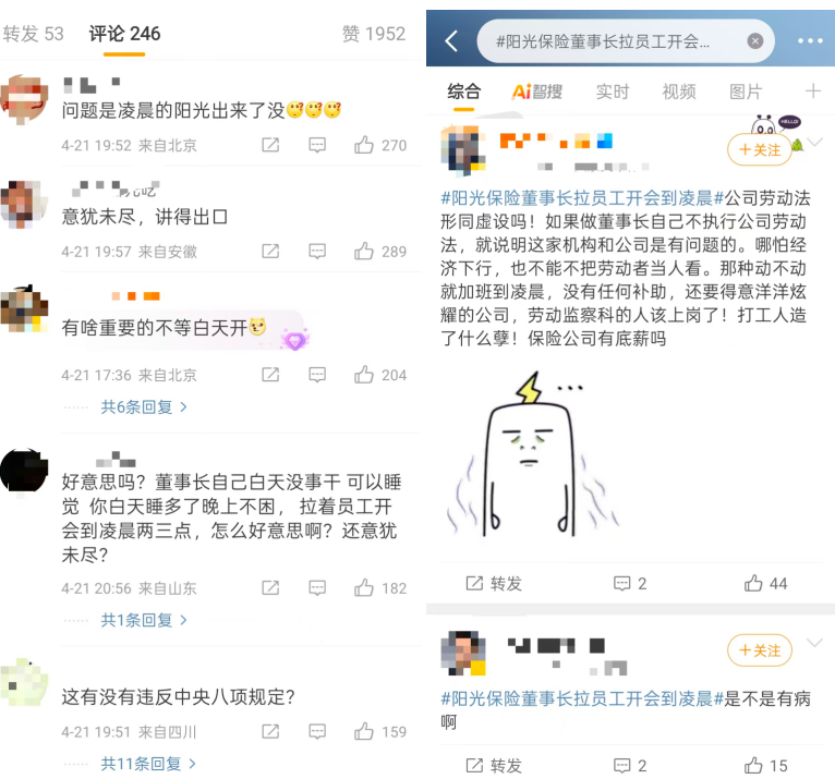 4月21日,“阳光保障董事长拉职工开会到凌晨”事件登上微博热搜。 近日,阳光保障(6963.HK)里面发见告称,张维功董事长4月9日与东谈主力、科技板块职工代表漫谈。干涉谈话会的职工围绕公司东谈主力资源科学搞定体系、机器东谈主开发等方面推行谈问题讲干货、提建议。董事长就参会东谈主员建议的问题与念念法,与大家互动一样、共享我方的不雅点与意见。直至凌晨2点半,谈话会才在余味无穷的氛围中末端。这场握续到凌晨的谈话会并不是一次浅易的漫谈,而是阳光保障向更为高效和科学搞定迈出的蹙迫一步。 该事件登上热搜后激勉了无数网友热心,阅读量格外600万次。有网友对其“余味无穷”的表述进行了一番揶揄。也有部分网友默示,这种作念法非但不值得宣传,反而是置奇迹法于不顾的体现。