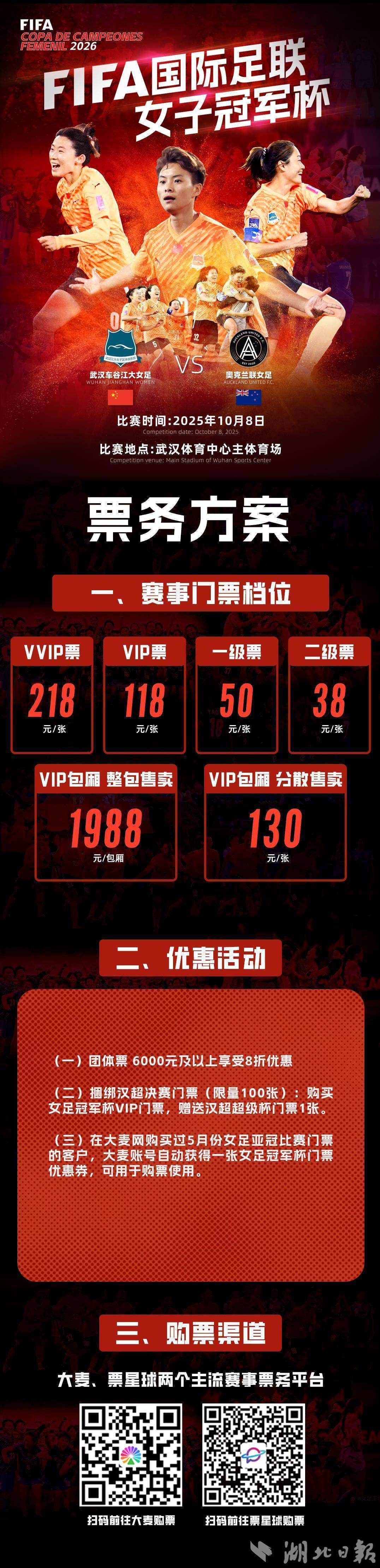 ▲奥克兰联女足获大洋洲足联女足冠军联赛冠军。 这也意味着,武汉车谷江大女足正在配置四强的路上。有球迷称,这是一场关乎3个“W”的巅峰对决,是武汉车谷江大女足(Women)从武汉(Wuhan)起程,迈向天下(World)舞台的新征途。绿茵赛场,两大洲冠军顶峰再会,必将诱导天下的眼神。 如斯重磅赛事,门票热度拉满! 为答允球迷不雅赛需求,让更多各人以亲民价钱不雅看顶级赛事,本次门票秉握“公益+阛阓”原则,主要设4档,分裂为218元/张、118元/张、50元/张、38元/张。官方购票渠谈为大麦、票星球App。 即日起,湖北日报脱色武汉体育中心推出“粉丝专属福利”:关注湖北日报微信公众号并留言,点赞量靠前者将得回免费赠票。首批赠票100张,送完抑遏。